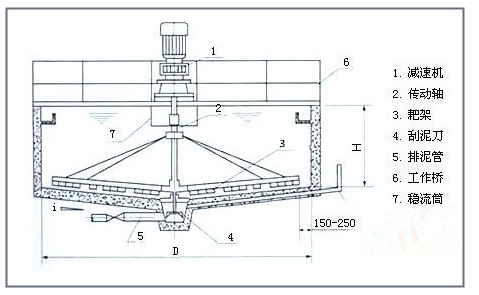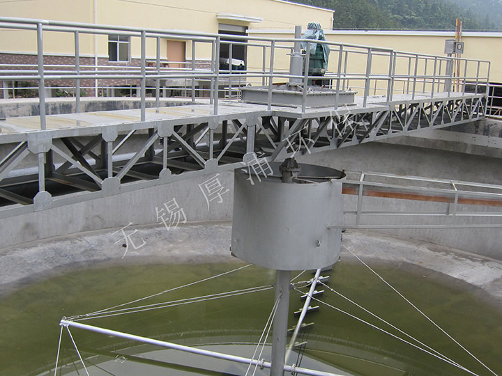 該係列刮泥機結構簡單,整台刮泥機的載荷都作用在工作橋架的中心,由中心驅動機構帶動刮集裝置旋轉,頂向刮板將沉澱池底的汙泥刮集到中心集泥槽中,靠靜水壓力從汙泥槽中排出。該機用於池徑較小的輻流式沉澱池。