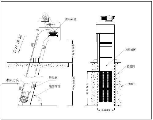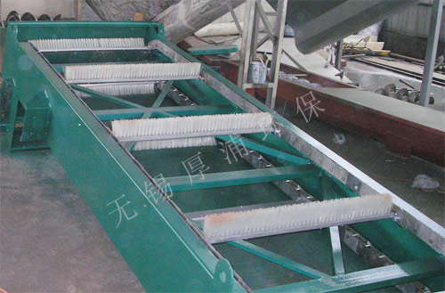 WBF轉刷網蓖式格柵除汙機主要由驅動裝置、機架、主軸、柵網、托渣板、固定板刷、回轉刷及牽引鏈組成。在電機驅動下,通過減速機減速後,帶動鏈輪與鏈條運動,固定在回轉鏈條上板刷沿柵網網麵由下而上移動,清掃網麵並帶走汙物,汙物運送至頂部時,大部分靠重力自行落至排渣都,少量附著在固定板刷上的汙物被轉動的回轉刷清除掉,完成除汙過程,液體則通過柵網的間隙流過,整個工作過程連續進行。